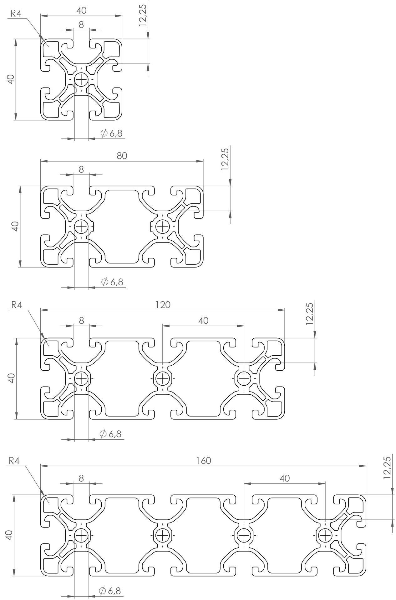 The depth of each profile slot is 12 mm. This is an important size when choosing which size of bolt to use, since a bolt that is too long will bite into the profile and cannot be tightend.