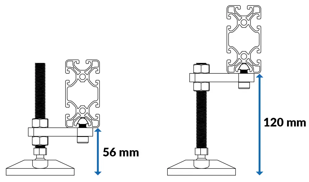 The bottom of the profile will be at a minimum of 56 mm, and a maximum of 120 mm with these feet.